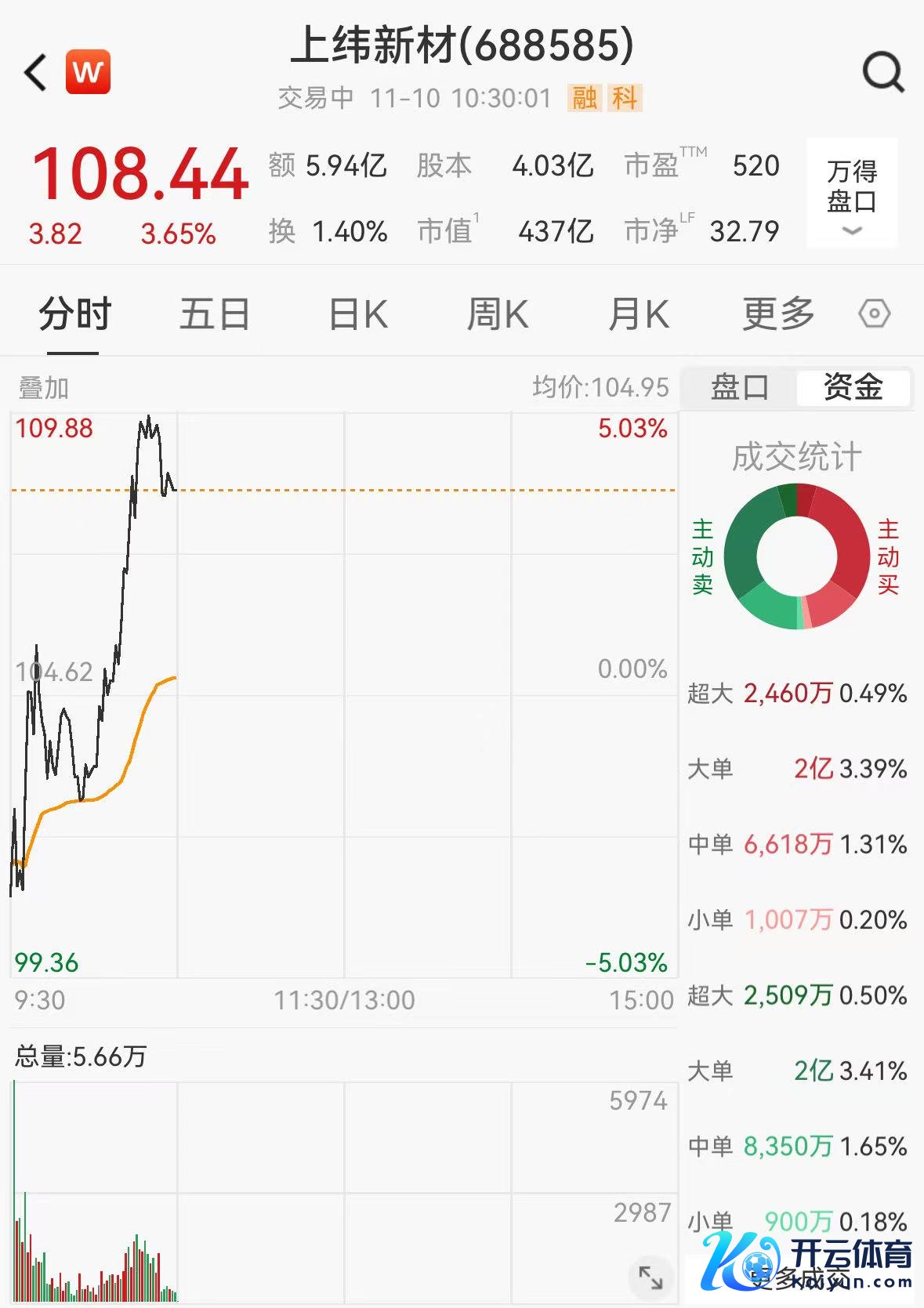 11月10日,上纬新材早盘半小时内一度涨近7%,终结10:30,报108.44元/股,总市值为437亿元。