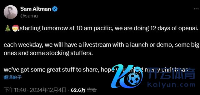 公司在推文中写说念:“12天、12场直播,一堆万里长征的新东西,OpenAI的12天行为期从来日开动。”
