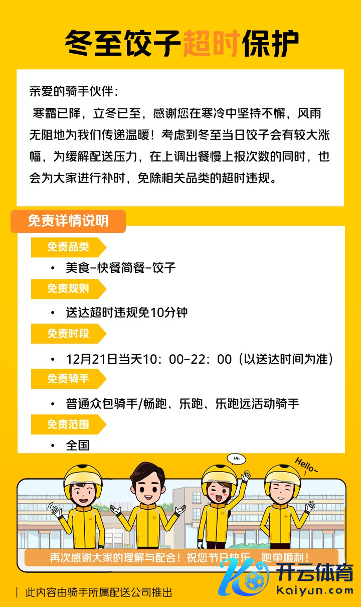 好意思团有关精采东谈主示意,为匡助骑手应酬冬季罕见节日订单岑岭的配送压力云开体育,除了已有的保险机制外,好意思团执续探索订单岑岭“超时免罚”等机制,为配送该类订单的骑手放宽时限条目,并自动剔除因超时导致的不闲散评价。