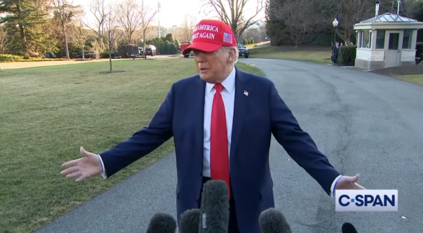 当地时间28日,特朗普在离开白宫时接纳记者采访。图为采访视频截图