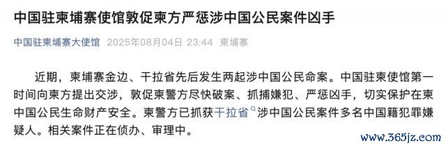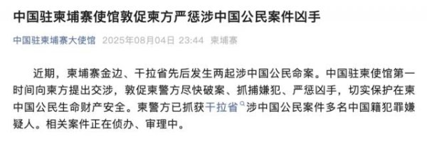 ①中国驻柬埔寨大使馆 8 月 4 日发布音书,柬埔寨金边、干拉省发生两起涉中国公民命案; ②中国驻柬使馆向柬方提议交涉,敦促柬警方尽快破案、捏捕嫌犯、重办凶犯,保护在柬中国公民安全。